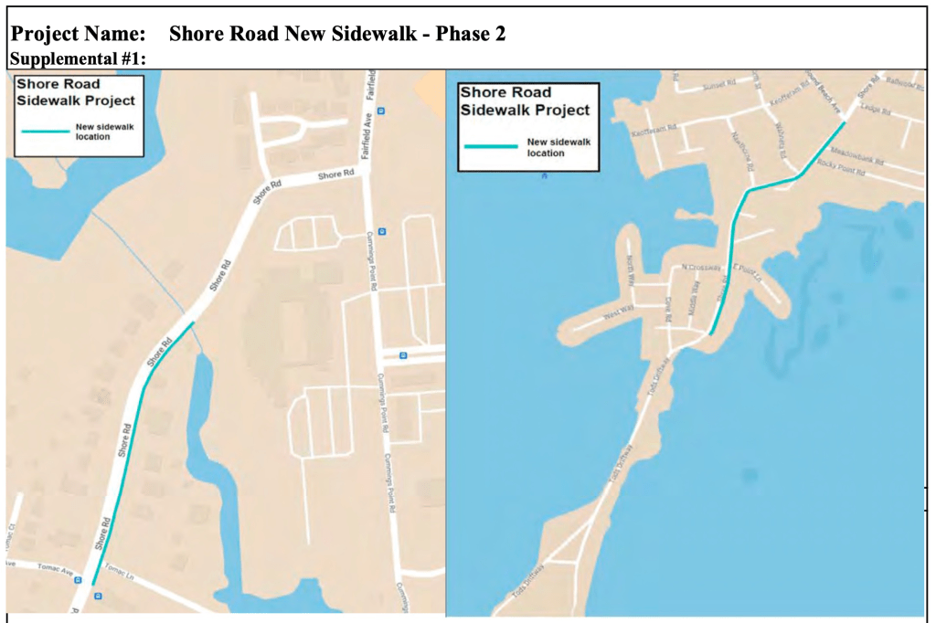 This project has been long requested, outlined, and on the list of Priority Sidewalks. A line item of $250,000 to design and engineer a sidewalk on Shore Road from Sound Beach to the rocky bridge approaching Tods Driftway is in the First Selectman’s 2024-2025 budget and is actively being discussed by the Board of Estimate and Taxation. (Click here for more information about the project on the Town website.)