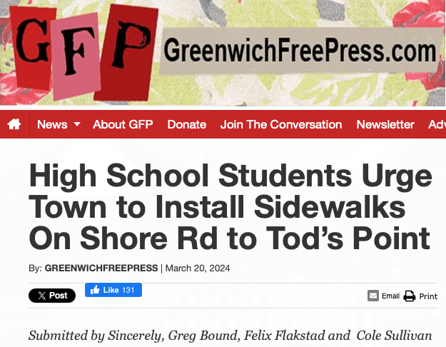 In 2022, a group of residents in Old Greenwich banded together to propose a sidewalk for a busy stretch of Shore Road that serves office workers, construction companies, residents, as well as school children and walkers. This sidewalk proposal was funded in 2022, and built in Fall 2023. It is actively enjoyed by residents from all over town.