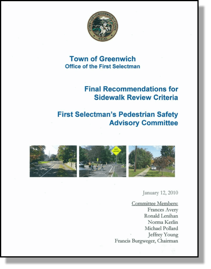 2015 Eastern Greenwich Neighborhood Plan – Identifies priority sidewalk areas, e.g., Shore Road, and highlights big pedestrian safety issues in Old Greenwich